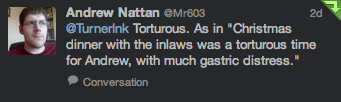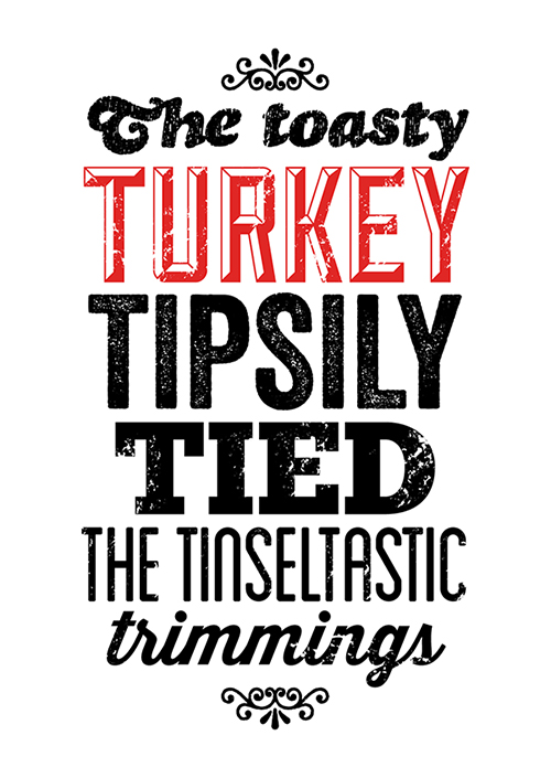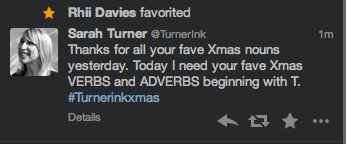 So, over a number of days on Twitter, I asked my followers for their favourite Christmas adverbs, verbs, nouns and adjectives beginning with a T. (For Turner Ink obvs.)
