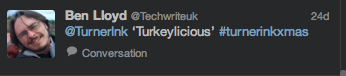 Every year I send a Turner Ink Christmas card to clients of the past, clients of the present and a bunch of suppliers and other good sorts that make Turner Ink tick. Over the years we’ve done quizzes, buzzword bingo and word searches. But this year we decided to let Twitter make the card, exquisite corpse stylee.